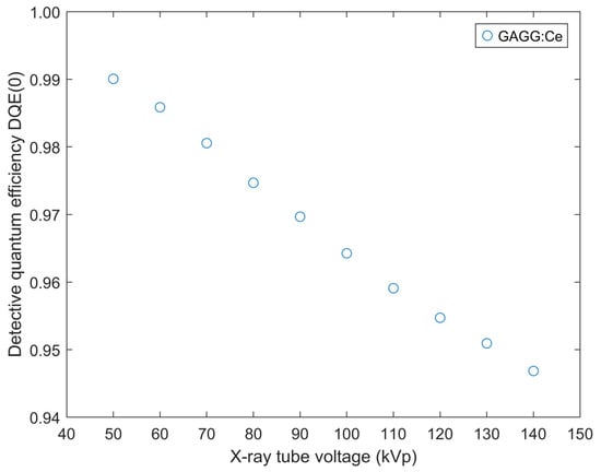 According to Equation (7), DQE(0) is dependent, upon the output signal and the X-ray absorption properties of the scintillator. For higher tube voltages AE and X-ray exposure are increased, while the X-ray absorption efficiency in the scintillator is decreased. The shape of the DQE(0) curve is due to the combined effect of these properties. Its high value, over 0.94, demonstrates that DQE in the energy range under investigation is more affected by QDE than the output signal variations. In the medical energy range in this study, GAGG:Ce showed better efficiency in comparison with other commonly used cerium-doped scintillators which along with its high light yield (LY) (46,000 photons/MeV) and high density (6.63 g/cm3) renders it as a promising material for further study.