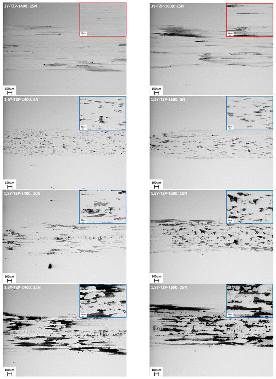 - At higher loads, the differences in wear rates between the materials diminished. Notably, at 25 N, the wear rates were all within the same order of magnitude, although the 1.5Y-TZP sample sintered at 1400 °C (3.96 × 10−7 mm3/Nm) still showed slightly better performance than its counterpart sintered at 1600 °C (5.02 × 10−7 mm3/Nm).
