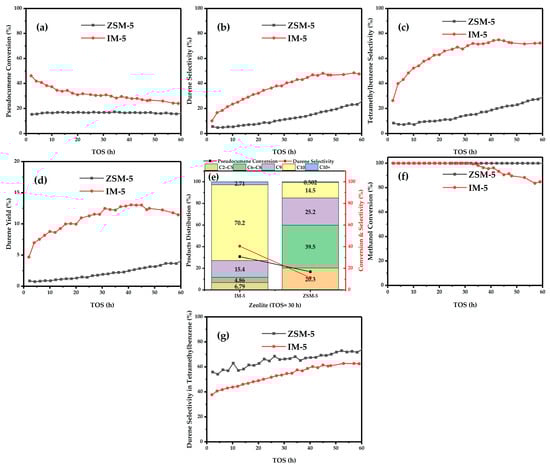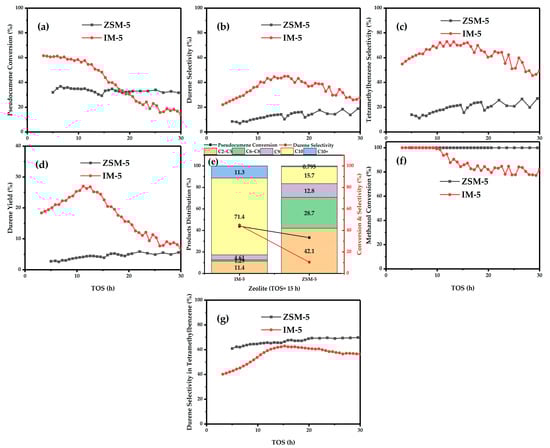 Catalytic performance of the IM-5 and ZSM-5 zeolite: (a) pseudocumene conversion; (b) durene selectivity; (c) tetramethylbenzene selectivity; (d) durene yield; (e) product distribution at 30 h; (f) methanol conversion; (g) durene selectivity in tetramethylbenzene, with numerical values indicating the percentage composition of each product category in %. Reaction conditions: 360 °C, 0.8 MPa, and WHSV = 1.557 h−1, n(1,2,4-TMB): n(ME) = 2:1.