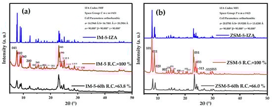 XRD patterns of the samples: (a) IM-5; (b) ZSM-5. The IM-5-IZA and ZSM-5-IZA represent the XPD curve of the standard IMF-type zeolite and MFI-type zeolite from the Structure Commission of the International Zeolite Association (SC-IZA), respectively. The arrays such as 041, 1 13 3, etc., represent the Miller indices (hkl) of the two zeolite crystals. The R.C. and its accompanying numerical values denote the relative crystallinity (expressed in percentage terms), defined as the ratio of the integrated intensity sum of the most intense diffraction peaks within the 2θ angular range of 22° to 27° to that of the parent zeolite.