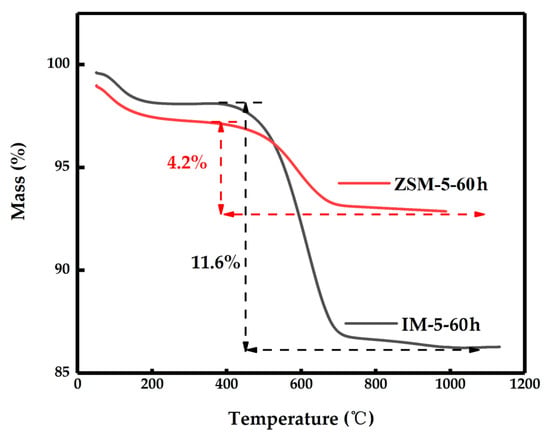 The diffraction peaks observed at 2θ = 7.65°, 8.87°, 9.28°, 12.40°, 15.46°, 18.67°, 23.11°, 23.42°, 24.18°, 25.05°, 26.63°, 28.88°, and 31.10° of both the IM-5 and IM-5-60 h samples indicated a variety of typical IMF topological structures (Figure 3a) [,]. The XRD pattern of the ZSM-5 zeolites is shown in Figure 3b. The characteristic diffraction peaks at 2θ = 7.9°, 8.8°, 23.4°, 23.9°, and 24.4° indicated that the both ZSM-5 and ZSM-5-60 h were pure-phase zeolites with an MFI topological structure []. The intensity of the XRD peaks of the deactivated zeolites were all weakened, among which the IM-5-60 h sample had the lowest relative crystallinity (63.8%).