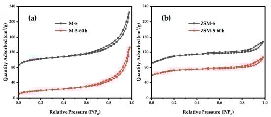The N2 adsorption–desorption isotherms of the IM-5 zeolites (a) and ZSM-5 zeolites (b) before and after 60 h.