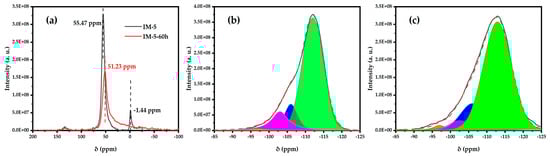 The 27Al MAS NMR spectrum (a) of the samples and the 29Si MAS NMR spectrum of IM-5 zeolite (b) and IM-5-60 h (c). The black solid line is the experimental curve. The red dotted line is the cumulative curve of Gaussian peaks. Numbers indicate the chemical shift (ppm).