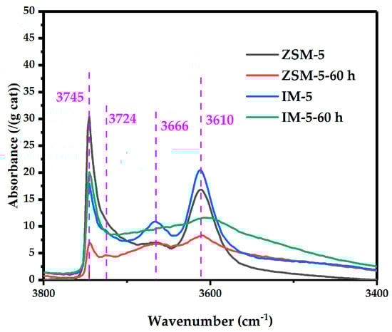 From the OH-IR spectra (Figure 7), it can be seen that the absorption peak intensities of both zeolites decreased after 60 h of reaction. After 60 h of reaction, the Si-OH-Al groups (with the wavenumber of 3610 cm−1, representing Brønsted acid sites) and Al-OH extra-framework groups (with the wavenumber of 3666 cm−1, representing Lewis acid sites) of the IM-5 zeolite almost disappeared, while the absorption peak of Si-OH groups on external surfaces (with the wavenumber of 3745 cm−1) increased slightly, and further observation using FT-IR was needed. These phenomena were consistent with the NMR. In contrast, the degree of decrease in each absorption peak of the ZSM-5 zeolite was smaller.