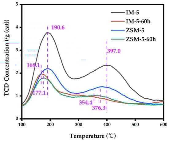 As illustrated in Figure 8 and Table 3, after 60 h, both zeolites showed a significant decrease in strong acid sites. The acid amounts of the IM-5 zeolite decreased, with the total acid amounts decreasing by 70%, among which the weak acid amounts decreased by 61% and the strong acid amounts decreased by 81%. The total acid amounts of the ZSM-5 zeolite decreased by 40%, including a 30% decrease in weak acid amounts and a 53% decrease in strong acid amounts. Compared with the ZSM-5 zeolite, the desorption temperatures of the desorption peaks of the IM-5 zeolite decreased more significantly. The decrease in the desorption temperature correlated with the reduction in zeolite acid strength, with the IM-5 zeolite exhibiting a more pronounced decrease in acid strength.