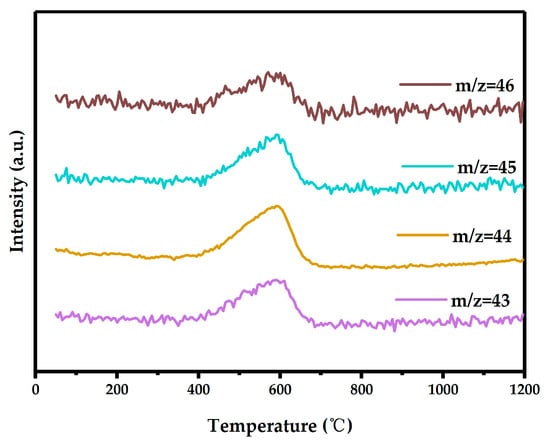 As indicated in Figure 10, molecules with mass-to-charge ratios of 43/44/45/46 represented the acetyl fragment (CH3CO+), carbon dioxide, the carboxyl fragment (COOH+), and the methyl formate fragment (HCOOCH3+), respectively []. Among them, three fragments were derived from the oxidation of unreacted methanol and its dehydration product, dimethyl ether.