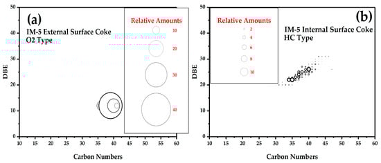 Figure 13 depicted bubble charts of carbon number, DBE (double bond equivalent), and relative amount distributions for coke deposited on the external and inthernal surfaces of IM-5 zeolite. For the carbon deposits on the external surface of IM-5 zeolite, the carbon number was mainly concentrated in the range of 36–40, and the double bond equivalent (DBE) was approximately 12. The carbon number of oxygen-free aromatics in the pore channels of IM-5 zeolite mainly ranged from 33 to 40, with DBE between 22 and 27. Additionally, the DBE increased monotonically with the carbon number, meaning that the molecular formulas of the carbon deposits in the pore channels of IM-5 zeolite can be expressed as C33–40H24–28.