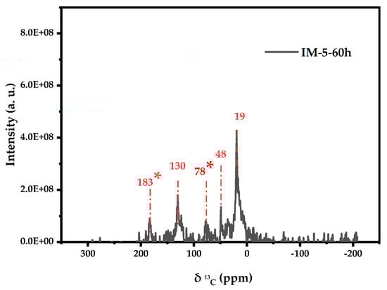 As outlined in Figure 14, the chemical shifts in the ranges of 0–50 ppm, 50–90 ppm, and 90–150 ppm corresponded to species such as saturated carbon, C-O, and sp2 carbon (aromatic carbon, olefinic carbon, or graphitized carbon), respectively []. The sidebands with chemical shifts of 183 ppm and 78 ppm are spinning sidebands. This is because the chemical shift of 130 ppm was between 183 ppm and 78 ppm, with an interval of approximately 53 ppm, which conformed to the interval law of spinning sidebands; and 130 ppm was the main peak, 183 ppm was its +1st order sideband (on the high-frequency side), and 78 ppm was its -1st order sideband (on the low-frequency side), which conformed to the characteristic of the relatively weak intensity of spinning sidebands [].