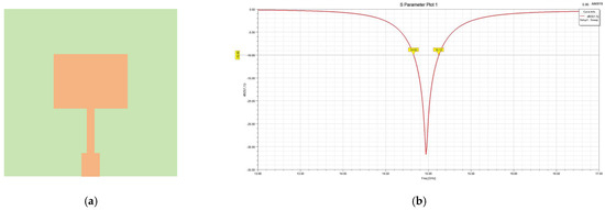 (a) A microstrip patch antenna designed based on the CBO ceramic substrate. (b) Simulated S11 curve for the current MPA. (c) Simulated 3D gain map of MPA at 14.97 GHz. (d) Corresponding radiation patterns in the E and H planes.