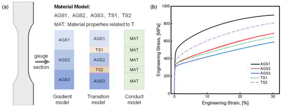 In this study, a novel computational strategy is proposed to replace the conventional discrete assignment of gradient properties by introducing artificially controlled temperature fields into the finite element model. It is important to emphasize that the temperature values used in this context bear no physical significance; rather, they serve solely to generate a smoothly varying gradient field. By assigning constant temperatures to the regions with uniform microstructures and allowing thermal conduction to establish a steady-state distribution, a smooth temperature gradient is formed across the model. This temperature field is then used to define spatially varying material properties corresponding to the underlying gradient structure. After the properties are assigned, the artificial temperature field can be removed, enabling subsequent simulations under various thermal conditions (either isothermal or non-isothermal) to assess the deformation behavior of materials with gradient properties. As illustrated in the conduct model in Figure 1a, we construct an integrated temperature-dependent material framework for three grain-size regimes: AGS1 (20 μm), AGS2 (70 μm), and AGS3 (180 μm), numerically corresponding to placeholder temperatures 20 °C, 70 °C, and 180 °C, respectively. These temperatures are not operating temperatures and do not have any specific physical significance. The gradient region, corresponding to the transition zone in the conventional model, is initialized with boundary temperatures that match these values. Material parameters across this region are then automatically interpolated via thermal conduction, achieving a smooth and continuous transition in mechanical behavior.