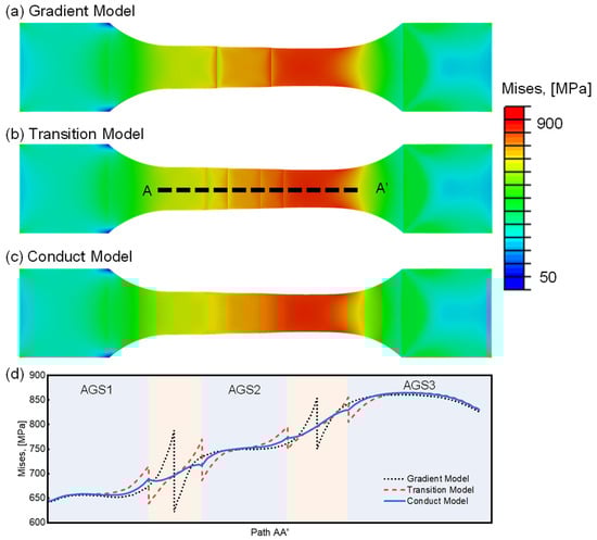 To verify the computational accuracy of the conduct model, a macroscopic finite element simulation of uniaxial tension is performed. The stress distributions obtained from the three different modeling approaches are illustrated in Figure 2a–c. It can be observed that the conduct model exhibits negligible stress concentration at the gradient junction while maintaining an overall stress field comparable to the other methods. A stress quantification analysis is further conducted along the transition path A-A′, as shown in Figure 2d. The stress differences at the AGS1/AGS2 gradient junction are found to be 165 MPa, 80 MPa, and 0 MPa for the gradient model, the transition model, and the conduct model, respectively. Similarly, at the AGS2/AGS3 interface, the corresponding differences are 103 MPa, 50 MPa, and 0 MPa. Notably, in both the gradient and transition models, the peak stress at the AGS2/AGS3 junction equals or exceeds the maximum stress in the AGS3 region, which represents a primary source of computational inaccuracy. In contrast, the stress distribution along the A-A′ path in the conduct model remains smooth and continuously elevated without abrupt fluctuations, thereby significantly improving the accuracy of the simulation.