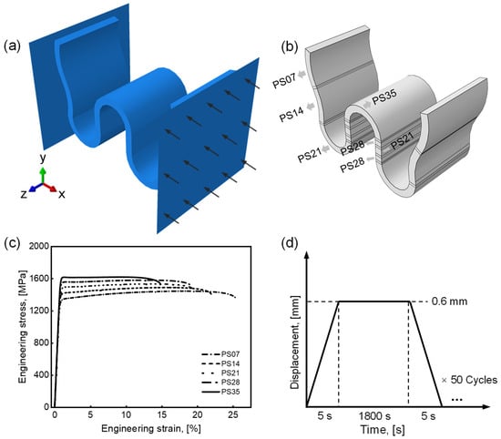 In contrast, for the gradient model, the stress–strain relationships corresponding to different plastic strain levels are integrated into a unified material framework. These are mapped onto regions within the W-shaped cross-section according to the strain gradient, which is represented through an equivalent gradient temperature field, as shown in Figure 3b. During service simulation, the sealing ring is subjected to 0.6 mm cyclic compression applied by rigid indenters on both sides, following the displacement-controlled loading profile illustrated in Figure 3d. Two key performance indicators, i.e., the springback rate (φ) and equivalent plastic strain (p), both related to fatigue deformation, are quantitatively evaluated. The springback rate φ is defined as follows: