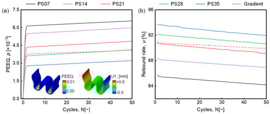 Due to the elevated internal dislocation density and enhanced mechanical properties of materials subjected to significant pre-deformation, their resistance to further plastic deformation during service is substantially improved. As a result, the homogenization models, each corresponding to different degrees of prior deformation, show that plastic strain accumulation at the trough region decreases with increasing deformation magnitude. Conversely, the springback rate exhibits a rising trend. Among these models, PS21 demonstrates performance at the trough region comparable to that of the gradient model and is therefore selected as a benchmark for comparison. As illustrated by the red solid and dashed lines in Figure 4a,b, the gradient model exhibits reduced plastic strain accumulation relative to the PS21 model. This indicates that introducing a gradient structure effectively suppresses fatigue-induced plastic strain accumulation, thereby enhancing the fatigue life of the sealing ring. Additionally, the improved springback resistance observed in the gradient model suggests superior sealing performance.