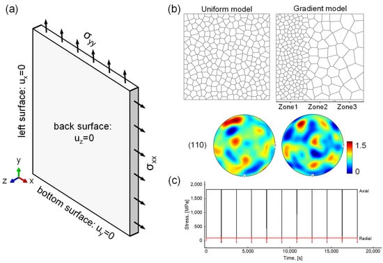 The crystal plasticity model with different grain sizes and gradients. (a) Boundary conditions, (b) geometry and pole figure, and (c) loading profile.