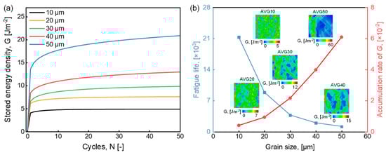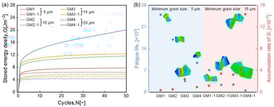 Simulation results of gradient grain-size model. (a) Evolution of stored-energy density G and (b) accumulation of stored-energy density and fatigue life.