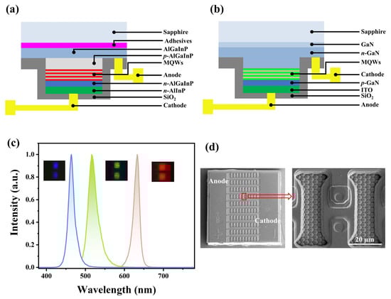Each RGB micro-LED array consists of 100 micro-LED chips arranged in a 10 × 10 matrix, with an overall device size of 850 μm × 850 μm. The structure of the red micro-LEDs, illustrated in Figure 1a, is initially grown as a double heterojunction epitaxial structure lattice-matched to a GaAs substrate, and subsequently transferred onto a sapphire substrate via adhesive bonding. A p-type GaP window layer is deposited on top of the heterostructure to function as a transparent current spreading layer. In contrast, the green and blue micro-LED chips, shown in Figure 1b, are fabricated from commercial InGaN/GaN blue LED epitaxial wafers grown on c-plane patterned sapphire substrates (PSS) by metal–organic chemical vapor deposition (MOCVD). Finally, a silicon dioxide (SiO2) layer is deposited by plasma-enhanced chemical vapor deposition (PECVD) on all RGB micro-LEDs as a sidewall passivation layer.