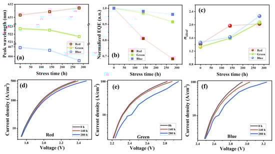 Figure 2a illustrates the evolution of peak wavelengths across different stress durations. For the red micro-LED, the peak wavelength exhibits a redshift of approximately 0.6 nm, increasing from 631.1 nm to 631.7 nm. In contrast, the blue micro-LED experiences a blueshift of about 1.0 nm, moving from 522.7 nm to 521.7 nm. Meanwhile, the green micro-LED’s peak wavelength changes by 0.5 nm, from 466.3 nm to 465.8 nm. Figure 2b shows the reduction in maximum EQE of the RGB micro-LEDs under prolonged electrical stress. All RGB devices exhibit a gradual degradation in efficiency over time. After 280 h of aging, the AlGaInP-based red micro-LEDs exhibit a reduction of 31.7% in maximum EQE, while those of InGaN-based green and blue micro-LEDs retain 91.4% and 96.1%, respectively. This discrepancy highlights a critical challenge in the reliability of AlGaInP-based red micro-LEDs with the efficiency droop rate exceeding 0.11%/hour, which is far larger than those observed in green (0.03%/hour) and blue (0.01%/hour) counterparts. At a current density of 10 A/cm2, the increase in the forward voltages of the RGB micro-LEDs exceeds 0.1 V, changing from 1.7 V to 1.9 V (red), 2.3 V to 2.4 V (green), and 2.5 V to 2.6 V (blue), respectively. With aging under high-temperature electrical stress, the forward voltage of RGB micro-LEDs gradually increases, as shown in Figure 2d–f. The voltage elevation observed in micro-LEDs under high-temperature electrical stress arises from resistive degradation, which stems from the deterioration of contact interfaces [21], proliferation of material defects [17], or aging of solder joints [22], causing increased series and contact resistance. Additionally, passivation layer deterioration further impairs carrier injection and current spreading, contributing to voltage rise.