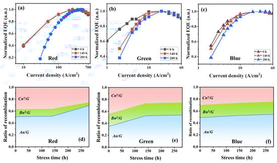 For the red micro-LEDs, with increasing aging time, SRH non-radiative recombination contribution (An/G) increases from 50.7% to 69.3%, the radiative recombination contribution (Bn2/G) drops from 12.1% to 5.0%, while the Auger recombination contribution (Cn3/G) decreases from 37.1% to 25.6% (Figure 3d). For green micro-LEDs, as stress time accumulates, An/G increases from 34.6% to 53.8%, Bn2/G remains almost unchanged, staying at around 20.0%, and Cn3/G decreases from 45.1% to 25.5% (Figure 3e). For blue micro-LEDs, An/G increases from 48.7% to 54.3%, Bn2/G decreases from 20.7% to 20.8% and Cn3/G varies from 30.5% to 24.8% as stress time increases (Figure 3f). The red micro-LEDs demonstrate a more notable increase in SRH non-radiative recombination, correlating with the significant efficiency degradation (Figure 2c). After electrical stress, elevated temperatures can accelerate dislocation motion, defect formation, and atomic diffusion processes. In particular, Ga and In diffusion in InGaN-based devices and Al diffusion in AlGaInP-based red devices may become more pronounced. These thermally activated mechanisms increase carrier trapping and non-radiative recombination, leading to reduced internal quantum efficiency (IQE). The red AlGaInP micro-LEDs experience more pronounced degradation, which can be attributed to their significantly higher current density corresponding to the maximum EQE, which is multiple times that of blue and green counterparts. The high current drives stronger heat generation due to self-heating, which accelerates thermal degradation originating from interfacial interdiffusion and the formation of non-radiative centers [26].