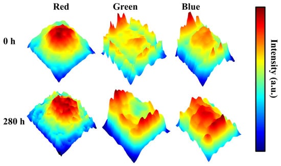 Mappings of luminous intensity of red, green, and blue micro-LED at 300 K before and after stress of 280 h. The RGB micro-LEDs are driven at the current densities corresponding to the maximum EQE.