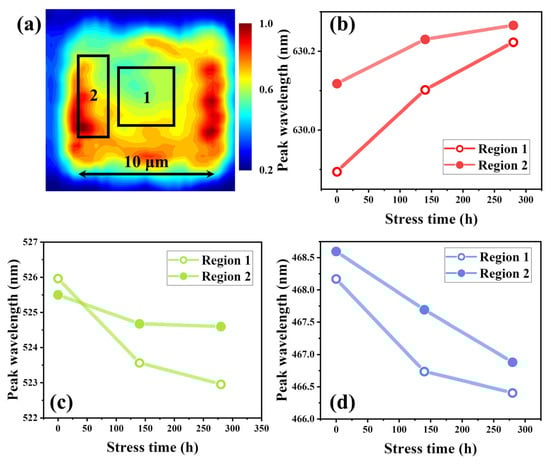 (a) locations of two regions in the mesa of micro-LEDs, and the peak wavelength of two regions for (b) red, (c) green, and (d) blue micro-LEDs under different stress time. The currents correspond to the maximum EQE.