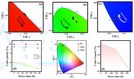 The chromatic stability of micro-LEDs is crucial for display applications since the color gamut of full-color displays is determined by the chromaticity coordinates of RGB micro-LEDs. The chromaticity coordinate shifts under prolonged operation may result in noticeable visual non-uniformity or color imbalance [27,28]. The chromaticity coordinates in CIE 1931 color space of RGB micro-LEDs under different stress time are illustrated in Figure 6a–c. The chromaticity coordinates of red micro-LEDs exhibit minimal variation with increasing stress time, consistently remaining near the edge of the chromaticity diagram. This indicates that red micro-LEDs can maintain high color purity over extended aging time. For the chromaticity coordinates of green micro-LEDs, which are crucial for RGB self-emissive displays [29], they shift curvilinearly towards the bottom-right direction as the stress time increases. For the blue micro-LEDs, the chromaticity coordinates a shift towards the top-left direction as stress time accumulates. Figure 6d illustrates the variation in color purity of RGB micro-LEDs as a function of stress time. As the stress duration increases, the color purity for the green and blue micro-LEDs decreases from 90.2% to 86.6%, and 98.6% to 97.9%, respectively. In contrast, the color purity of the red micro-LEDs remains stable at 100%. Figure 6e illustrates the triangular area defined by the chromaticity coordinates of the RGB micro-LEDs corresponding to the maximum EQE before and after stress. As the stress time increases, the triangular area slightly decreases. There are two definitions of color gamut: color gamut area and color gamut coverage. In this work, we utilized the area ratio of National Television Standards Committee (NTSC) color gamut to compare the gamut before and after aging of 280 h, demonstrating that the color gamut drops from 122.2% to 115.2% (Figure 6f).