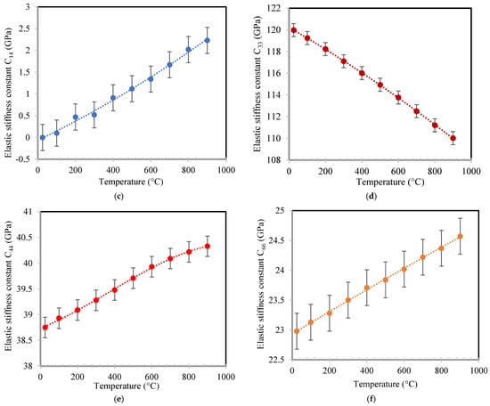 Thermal evolution of the elastic stiffness constants: (a) C11, (b) C13, (c) C14, (d) C33, (e) C44, and (f) C66.