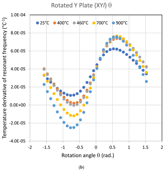 Figure 7 and Figure 8a show no compensated cuts at an ambient temperature for  Such a rotation transforms the Y-plate to an X one, and the thickness shear mode disappears. For temperatures higher than ~460 °C, Figure 8b,c emphasize that temperature-compensated cuts exist, and for  = 0, we still find the results of the (YXl) θ plates, as illustrated in Figure 3a,b.