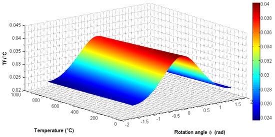 Three-dimensional plot of the first-order resonant frequency temperature coefficient  of the singly rotated (Yxt)  plate in relation to the rotation angle  and the temperature (in the range of [25 °C, 900 °C]).
