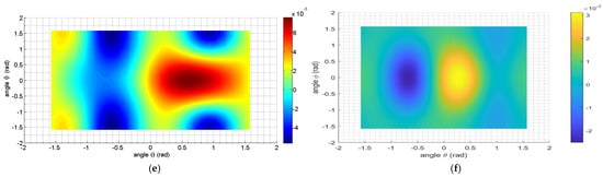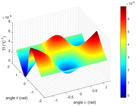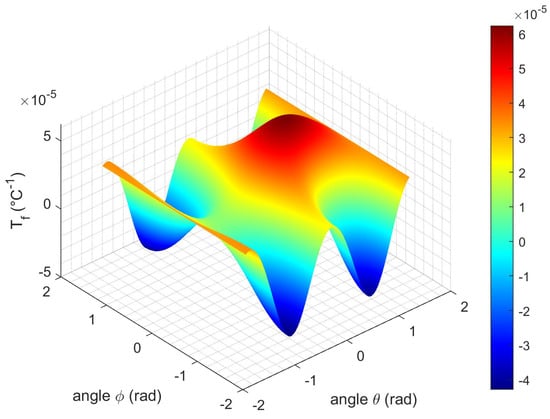 As shown in Figure 6b,d,f, the values of  in relation to θ and ϕ vary from the range [−1.10−7, +3.10−7] at 20 °C to [−2.10−7, +3.10−7] at 900 °C. In the entire temperature range, some rotated angles exist for which the  is canceled and the resonant frequency depends linearly on the temperature if the first-order temperature coefficient is non-zero.