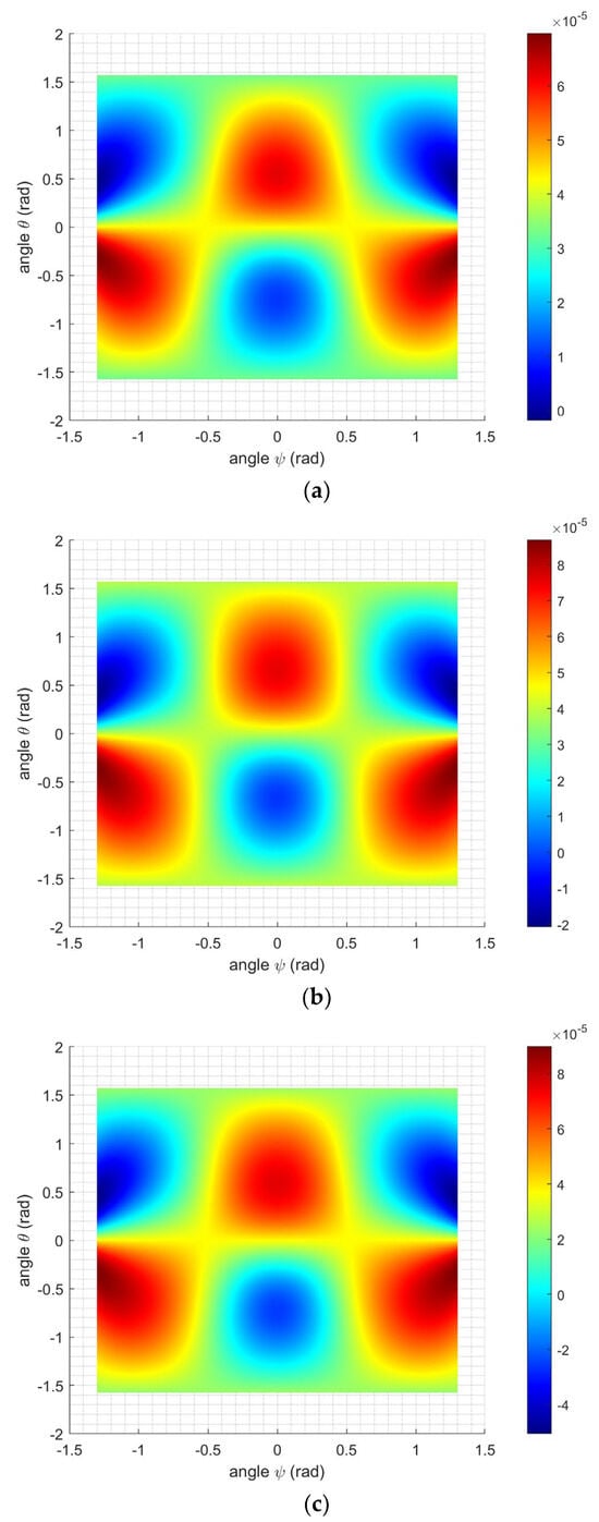 Two-dimensional plot (projection on θ–ψ plan) of the temperature derivative of the resonant frequency (Tf) of the doubly rotated (YXwl) ψ/θ plate in relation to the rotation angles θ and ψ at (a) T = 20 °C; (b) T = 500 °C; and (c) T = 900 °C.