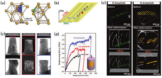 (a) A three-dimensional (3D) diagram demonstrating the combined analysis of the temperature, strain rate, and oxygen content dependences of the dislocation morphology; (b) modified GSF energy on the prismatic plane calculated with density functional theory (DFT) and the dynamic migration path of oxygen atoms during the sliding process; and (c–e) the nucleation, propagation of abnormal twins, and their association mechanism with brittle fracture in titanium alloys with high oxygen content (0.88 at %) (Ti-0.3O) during tensile fracture at a low temperature (~100 K) [28].