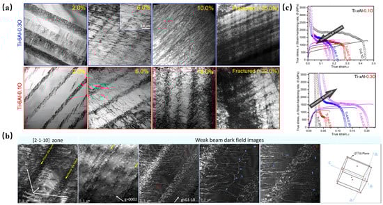 Emerging strategies exploit the dual role of oxygen through advanced manufacturing and PT. Techniques such as high-pressure torsion (HPT) and hot isostatic pressing (HIP) redistribute oxygen atoms and modify dislocation patterns to mitigate embrittlement. Such “active regulation” approaches replace traditional deoxidation, enabling concurrent strength–ductility enhancement through controlled oxygen-mediated strengthening. Novel alloy design strategies based on solute element synergy have been developed. Chong et al. [14] systematically investigated the multiscale regulation mechanism of deformation behavior by co-alloying titanium with 6 wt.% Al and 0.3 wt.% O. Their work revealed that the synergistic interplay between Al-induced short-range ordering (SRO) domains and the interstitial pinning effect of oxygen effectively suppresses the planar slip mode dominated by oxygen-mediated “mechanical shuffling” in conventional titanium alloys. The synergistic effect of interstitial oxygen and the SRO of Al hinders dislocation movement and promotes dislocation entanglement. Consequently, the activation energy for cross-slip decreases, resulting in an increase in dislocations on multiple slip surfaces. The three-dimensional network formed by cross-slip activation offsets the strain concentration (Figure 2a,b). Consequently, the alloy exhibited enhanced strain-hardening capability (Figure 2c) and delayed strain localization, establishing a new pathway for oxygen-utilizing titanium-alloy design.