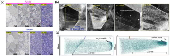 Chong et al. [26] demonstrated that Ti-0.3O achieves significant grain refinement relative to pure titanium under equivalent thermomechanical treatments, which is attributed to oxygen-induced boundary pinning effects (Figure 3), a finding corroborated by Cai et al. [27]. This refinement mechanism primarily originates from the dynamic dragging effect induced by interstitial oxygen atoms through their pinning and interaction with grain boundary migration, thereby effectively restraining grain coarsening. Notably, the ultrafine-grained microstructure facilitated homogeneous oxygen distribution within the intragranular regions while promoting dispersed dislocation arrangements, which completely eliminated the planar slip patterns typically observed in conventional titanium alloys. TEM observations revealed the predominant activation of high-density <c + a> pyramidal dislocations in the Ti-0.3O alloy, a phenomenon attributed to the intensified lattice distortion and elevated stacking fault energy caused by oxygen interstitials. This dislocation-mediated plasticity mechanism not only suppresses deformation twinning through oxygen-induced crystalline symmetry modification, but also delays microcrack nucleation and void propagation via synergistic motion across multiple slip systems, ultimately enhancing the plastic deformability of the alloy. As the grain size of Ti-0.3O decreased, its El increased from 1.5% to 14.0% (from 68 μm to 2 μm), while its UTS increased from 1.0 GPa to 1.25 GPa.