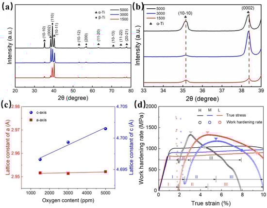 (a,b) X-ray diffractometer (XRD) and the corresponding magnified pattern; (c) lattice parameter evolution (c/a ratio) with increasing oxygen content; and (d) work-hardening behavior under varying oxygen levels [54].