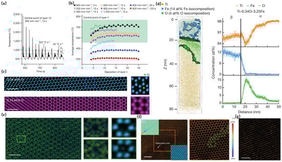 Song et al. [92] used L-DED technology and added TiO2 to construct four alloys with varying oxygen contents (0.15 wt.%, 0.35 wt.%, 0.50 wt.%, and 0.70 wt.%) and 3 wt.% Fe. Representative alloys Ti-0.34O-3.25Fe and Ti-0.50O-3.17Fe exhibit UTS of 1157 ± 3 MPa and 1194 ± 8 MPa, respectively, with fracture strains (ε) maintaining 9.0 ± 0.8% and 9.0 ± 0.5%, demonstrating significant superiority over conventional cast alloys. The L-DED process, leveraging rapid solidification kinetics and dynamic thermal cycling modulation (Figure 8a,b), promotes the formation of refined equiaxed β grains with internal α-β lamellar structures. Oxygen atoms preferentially segregate at α-phase interfaces, creating a nanoscale chemically heterogeneous distribution characterized by high-oxygen interfacial regions (strengthening zones) and low-oxygen cores (ductile zones). Notably, β-phase regions remain oxygen-depleted (<0.03 at%) but exhibit iron enrichment. APT and scanning transmission electron microscopy (STEM) analyses reveal two critical mechanisms: ① α-phase strengthening: oxygen segregation at HCP interstitial sites within the α phase (Figure 8c,d) induces localized charge density gradients (Figure 8e) and generates Cottrell atmosphere pinning effects (Figure 8f), effectively hindering dislocation motion. ② β-phase strengthening: The heterogeneous distribution of Fe in β-phase (Figure 8g) induces lattice distortions, creating localized strain fields that reinforce the matrix. Thermodynamic partitioning during L-DED processing strongly stabilizes the α phase while suppressing β-phase volume fraction. This process-engineered nanoscale oxygen/iron partitioning strategy establishes a dual-phase strengthening paradigm, overcoming the traditional strength–ductility trade-off in titanium alloys.