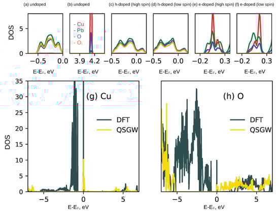 QSGW electronic density of states: of (a) valence and (b) conduction states of undoped Pb9Cu(PO4)6O and (c) high spin and (d) low spin solutions for the hole doped and (e) high spin and (f) low spin solutions for the electron doped Pb9Cu(PO4)6O. In (g,h) we show the density of states comparisons between QSGW and DFT for Cu and O states for the electron doped case.