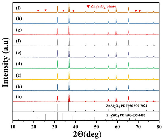 XRD patterns of the ZAZS ceramics sintered at 1400 °C for 6 h: (a) x = 0.1; (b) x = 0.2; (c) x = 0.3; (d) x = 0.4; (e) x = 0.5; (f) x = 0.6; (g) x = 0.7; (h) x = 0.8; (i) x = 0.9.