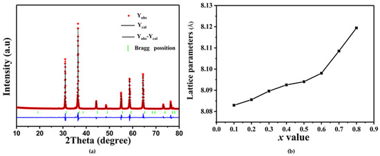 (a) Rietveld refinement of ZAZS (x = 0.8) sample; (b) lattice parameters of ZAZS solid solutions as a function of the x value.