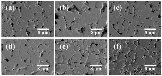SEM micrograph of the ZAZS ceramics sintered at 1400 °C for 6 h in air atmosphere: (a) x = 0.1; (b) x = 0.2; (c) x = 0.4; (d) x = 0.6; (e) x = 0.7; (f) x = 0.8.