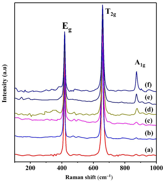 Figure 4 shows three principal Raman-active modes in the ZAZS spinel framework. The Eg band at approximately 420 cm−1 arises from the asymmetric bending of ZnO4 tetrahedra, while the T2g band near 660 cm−1 corresponds to symmetric stretching of the same units. In addition, the high-frequency A1g mode at around 860 cm−1, attributed to AlO4 tetrahedral vibrations [15], exhibits pronounced compositional dependence. As the [Zn0.5Si0.5]3+ content increases (x = 0.1–0.8), this A1g peak not only gains intensity but also narrows markedly—its full width at half maximum (FWHM) decreases—indicating enhanced crystallinity and reduced phonon damping. Such FWHM reduction is well known to reflect lower defect concentration and diminished cation disorder, both of which contribute to a superior microwave Q × f [19,20]. By contrast, the positions of the Eg and T2g bands remain essentially invariant, confirming that the local tetrahedral geometry is preserved across all substitution levels. This sharpening of the A1g band therefore provides spectroscopic evidence that increased [Zn0.5Si0.5]3+ substitution fosters a more ordered lattice, directly correlating with the observed improvements in dielectric quality factor.