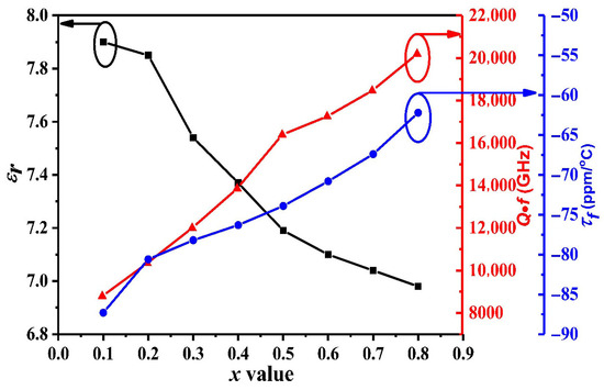 The εr, Q × f, and τf values of the ZAZS ceramics as a function of the x value.