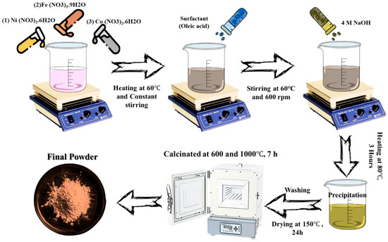 2.2. Synthesis of Co2+-Doped NiFe2O4 Nanocomposite