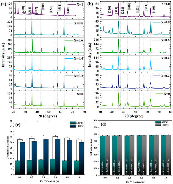 - The X-ray diffraction (XRD) profiles confirmed the spinel structure of the powders obtained. Higher synthesis temperatures resulted in sharper, more symmetric peaks that reflected better crystallinity. Moreover, the broadening of peaks decreased with an increase in temperature, consistent with increased particle sizes and an improved crystal structure. In addition, increasing cobalt concentration also increased the grain size, unit cell volume, and lattice constant.