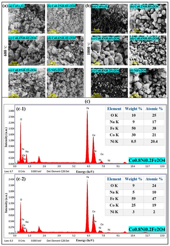 - SEM images showed that the particle sizes ranged between 13–19 nm at 600 °C and 28–36 nm at 1000 °C, demonstrating good agreement with the XRD results.
