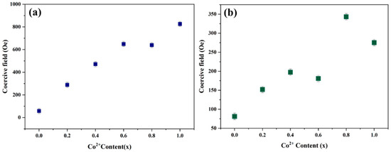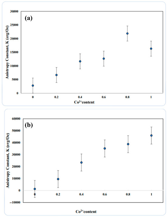 - Vibrating sample magnetometry (VSM) analysis demonstrated that coercivity increased almost linearly with higher cobalt concentrations at both synthesis temperatures. The inherently higher anisotropic nature of cobalt ions compared to nickel ions resulted in an increase in coercivity with cobalt doping. This increase in coercivity can be attributed to the enhancement of the anisotropic field, which subsequently raises domain wall energy.
