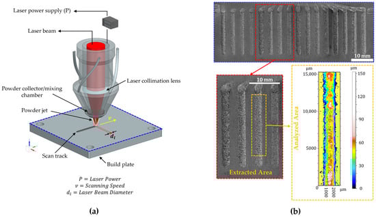 (a) DED process schematic diagram and (b) the coating Colmonoy tracks on AISI 304 substrate scanned and analyzed by digital optical microscope.