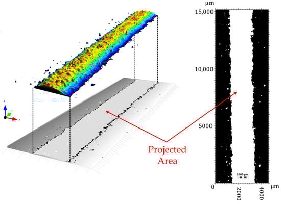 The sub-index was calculated taking into consideration the projected area of each CST, as shown in Figure 2. This contribution considers track stability in the XY plane by analyzing the ratio between the mean projected perimeter and the real projected perimeter of the CST (), as shown in Equation (3). The mean projected perimeter is calculated from the mean width (w) and the length of CST (L), while the real projected perimeter has been extracted and calculated in ImageJ (version 1.54g).