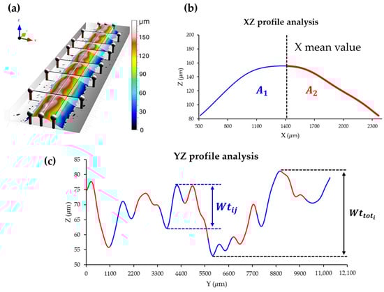 In order to avoid the effect of roughness on the final result, the calculation was performed on the waviness profiles when evaluating the XZ and YZ material distribution. Specifically, the waviness was extracted by applying an L-filter. Concerning , the calculation is based on an analysis of the asymmetry related to the M-profile extracted in subsequent planes perpendicular to the length of the CSTs, as shown in Figure 3a and in Equation (4). In particular, this value is calculated as the error relating to a perfectly symmetrical profile, where the section area on both sides of the mean X value is equal. This approach is similar to the calculation method applied by Alya et al. [52]. The higher the difference between the two section areas, the lower will be the final percentage representing material distribution over XZ plane.
