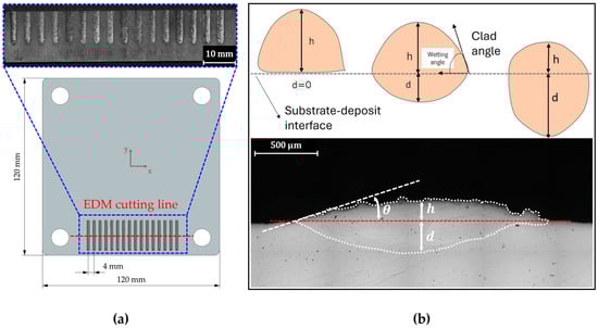 (a) EDM cutting line and extracted samples: first CST on the left is P06-F04 while last track on the right is P10-F10. (b) Parameters used for dilution ratio calculation and clad angle schematic representations [21].