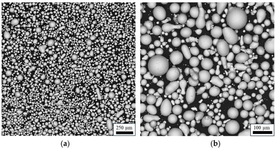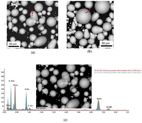 Using the backscattered electron (BSE) signal to characterize the morphology of the powder particles also allowed us to highlight areas of different contrast on some of their surfaces, as indicated by the arrows in Figure 6. Chemical analysis of the dark-contrast areas indicated by the arrows in Figure 6 revealed high levels of silicon and oxygen, confirming that these are silicon oxides (SiO2) formed on the surface of Colmonoy 227 particles during the manufacturing process.